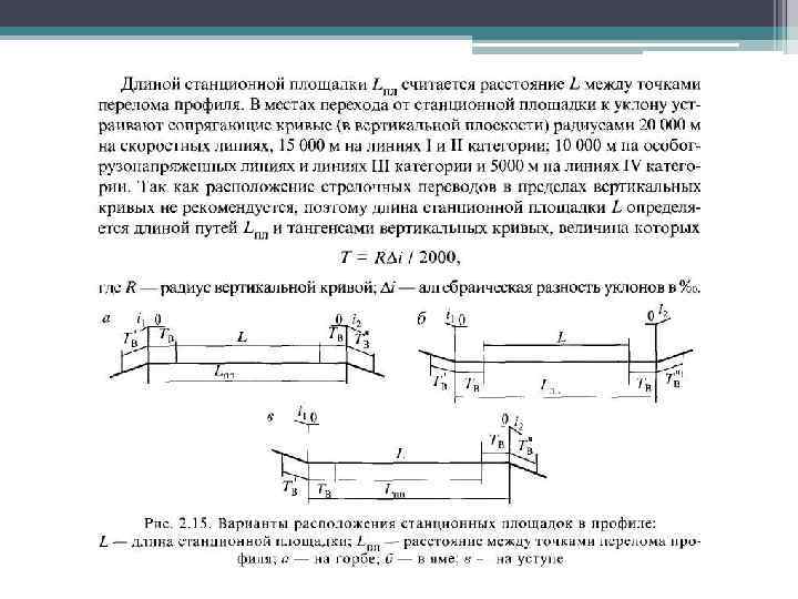 Расположение станционных путей в плане и профиле 2. 7. 1. • Участок профиля, где размещаются станция, разъезд или обгонный пункт, называется станционной площадкой. Можно выделить три варианта распо ложения станционной площадки в профиле (рис. 2. 15). Расположение станционной площадки на возвышенности «на горбе» (рис. 2. 15, а), обеспечивает благоприятные условия для замедления поездов на подходе к раздельному пункту, а также для разгона после остановки, безопасность одновременного приема на однопутных линиях, но при этом ухудшаются условия трогания поезда, задержанного перед входным сигналом. • Расположение станционной площадки в углублениях профиля «в яме» (рис 2. 15, б) ухудшает условия разгона поездов после остановки и условия одновременного приема поездов на однопутных линиях, но устраняется опасность ухода вагонов с роликовыми подшипниками на перегон. • Расположение станционной площадки на уступе (рис. 2. 15, в) занимает среднее положение по своим качествам между двумя предыдущими вариантами.