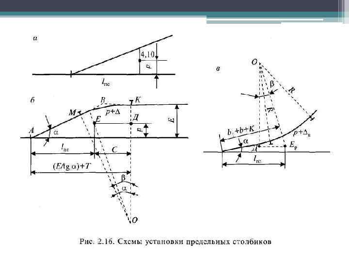 • Имеются три случая установки выходных и манев ровых сигналов (рис. 2. 18). • Случай 1 — предельный столбик, ограничивающий длину пути в данном конце станции (парка), располагается в одном междупутье с выходным сигналом с этого пути. Расстояние от центра стрелочного перевода до сигнала определяется таким же образом, как и до предельного столбика, но значение р следует брать равным половине междупутья, допускающего установку сигналов. Для практических целей разработаны таблицы расстояний до сигналов в зависимости от марки крестовины, ширины междупутья и радиуса кривой (Приложение В). • Случай 2 — сигнал, находящийся в разных междупутьях с предельным столбиком для данного пути, устанавливают в створе с изолирующим стыком, т. е. на расстоянии 3, 50 м от предельного столбика. • Случай 3 — выходной сигнал, за которым уложен противошерстный стрелочный перевод, может быть установлен в створе со стыком рамного рельса, т. е. на расстоянии а от центра стрелочного перевода.