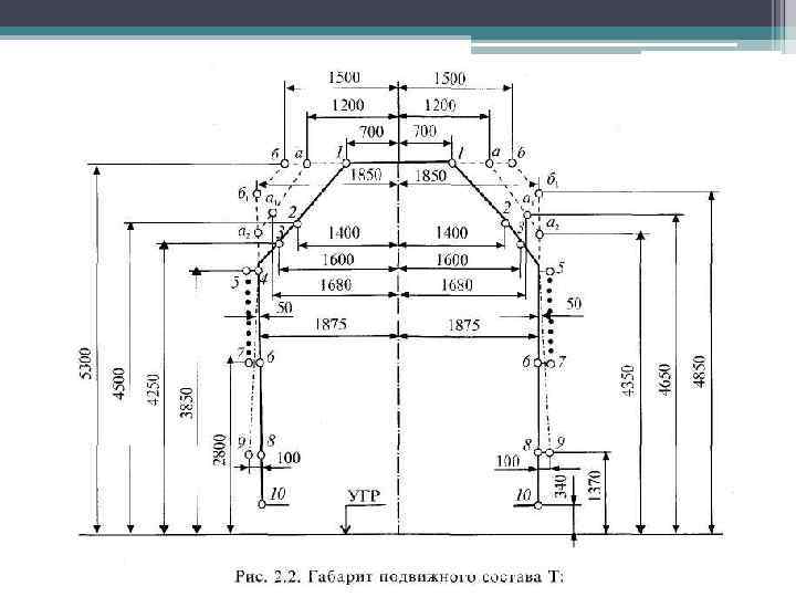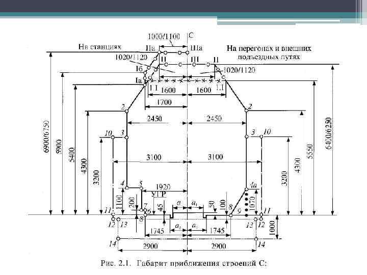 Габариты • Габаритом приближения строений железных дорог называется предель ное, поперечное, перпендикулярное оси пути очертание, внутрь которого, помимо подвижного состава не должны заходить никакие части сооруже ний и устройств, за исключением частей устройств, непосредственно взаи модействующих с подвижным составом (контактные провода, вагонные за медлители в рабочем состоянии и др. ).