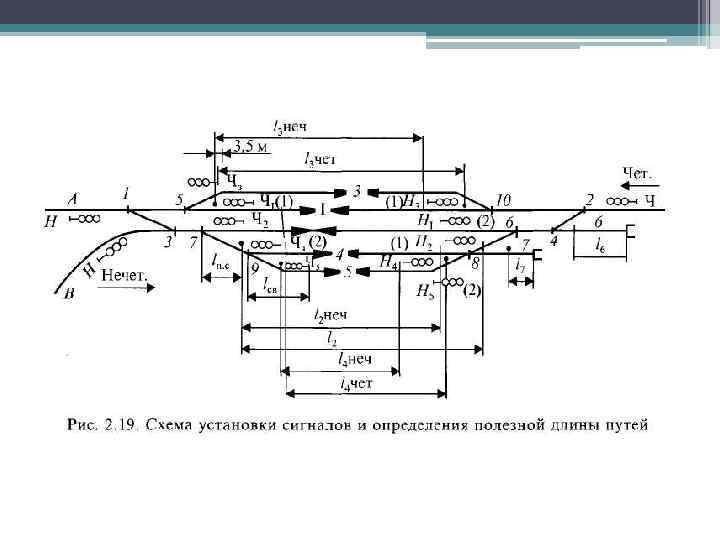 Если станция имеет отдельные парки для приема нечетных и четных поез дов, пути в нечетном парке нумеруют порядковыми нечетными номерами, а в четном — порядковыми четными номерами. Стрелочные переводы нумеруют порядковыми нечетными цифрами со стороны прибытия нечетных поездов и четными со стороны прибытия четных поездов. Нумерация начинается от входных стрелок. На станциях с большим путевым развитием стрелочные переводы нумеруют по паркам, причем каждо му парку присваивается своя сотня номеров, например, 100— 199, 200— 299 и т. д. Границей между четными и нечетными номерами служит ось парка, а на станциях с небольшим путевым развитием — ось пассажирского здания. Стре лочные переводы стрелочных улиц и съездов имеют непрерывную нумерацию (например: съезды 1— 3, 2— 4, стрелочная улица 5— 7 — 9— 11, 6— 8— 10). Сигналам на планах и схемах станций присваивают: • входным четным букву Ч, входным нечетным Н без индексов; • выходным — те же буквы с индексами, соответствующими номеру пути (Ч 1, Ч 2>Н 1, Н 2 ит. д. ).