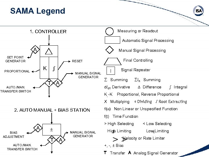SAMA Legend Measuring or Readout 1. CONTROLLER Automatic Signal Processing A Manual Signal Processing SET POINT GENERATOR Final Controlling RESET ∫ K PROPORTIONAL MANUAL SIGNAL GENERATOR T AUTO. /MAN. TRANSFER SWITCH A | Signal Repeater ∑ Summing d/d 1 Derivative K, -K ∆ Difference ∫ Integral Proportional, Reverse Proportional X Multiplying 2. AUTO MANUAL + BIAS STATION ∑/h Summing ÷ Dividing √ Root Extracting f(x) Non Linear or Unspecified Function f(t) Time Function AUTO. /MAN. TRANSFER SWITCH ± T A MANUAL SIGNAL GENERATOR < Low Selecting High Limiting | > Low|Limiting > BIAS ADJUSTMENT A > High Selecting Velocity or Rate Limiter +, -, ± Bias T Transfer A Analog Signal Generator