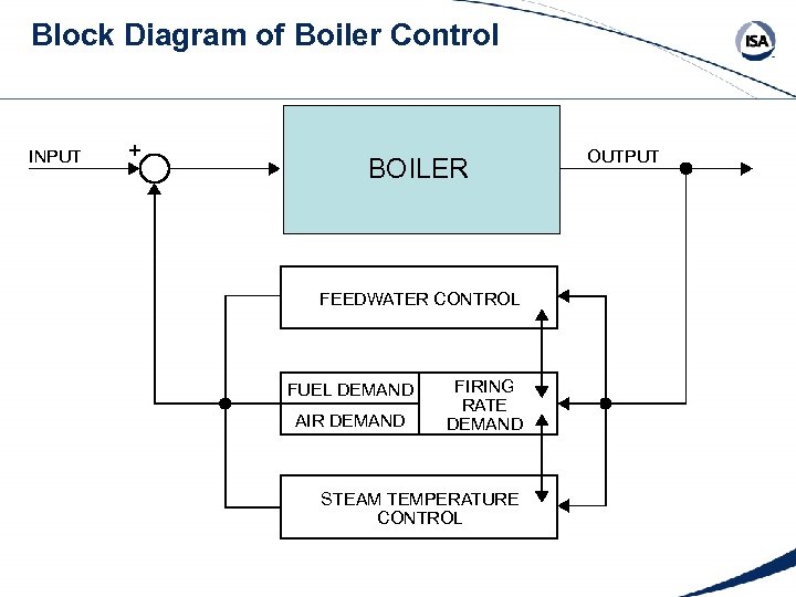 Block Diagram of Boiler Control INPUT + BOILER FEEDWATER CONTROL FUEL DEMAND AIR DEMAND FIRING RATE DEMAND STEAM TEMPERATURE CONTROL OUTPUT