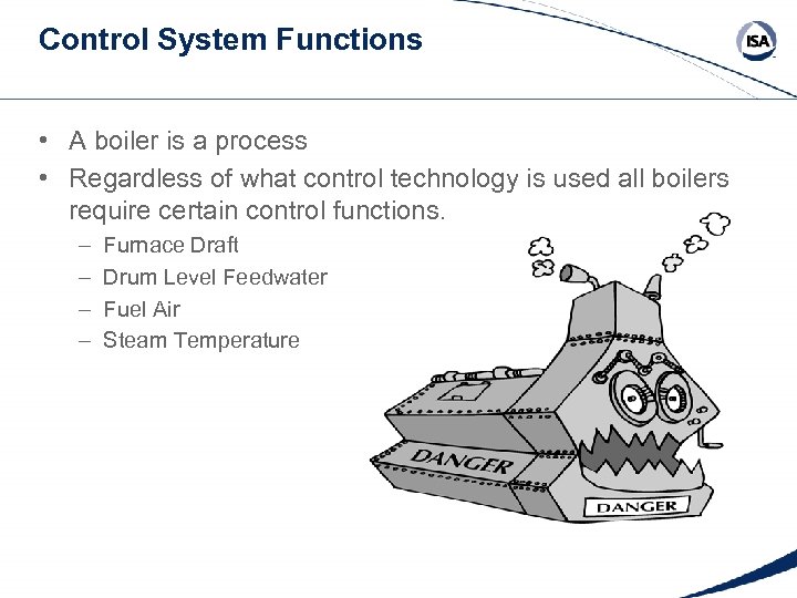 Control System Functions • A boiler is a process • Regardless of what control technology is used all boilers require certain control functions. – – Furnace Draft Drum Level Feedwater Fuel Air Steam Temperature