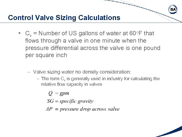 Control Valve Sizing Calculations • Cv = Number of US gallons of water at 60 o. F that flows through a valve in one minute when the pressure differential across the valve is one pound per square inch – Valve sizing water no density consideration: – The term Cv is generally used in industry for calculating the relative flow capacity in valves