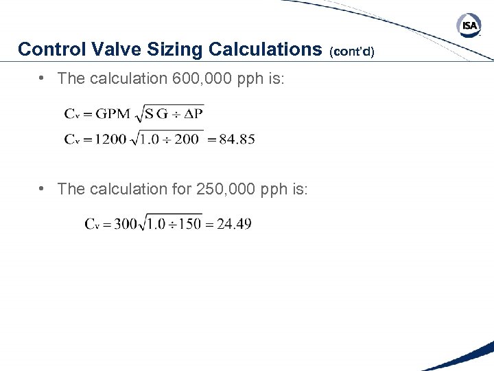 Control Valve Sizing Calculations • The calculation 600, 000 pph is: • The calculation for 250, 000 pph is: (cont’d)
