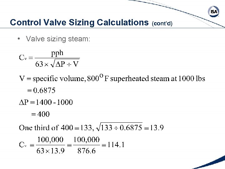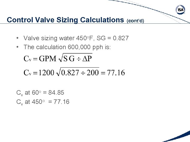 Control Valve Sizing Calculations (cont’d) • Valve sizing water 450 o. F, SG = 0. 827 • The calculation 600, 000 pph is: Cv at 60 o = 84. 85 Cv at 450 o = 77. 16