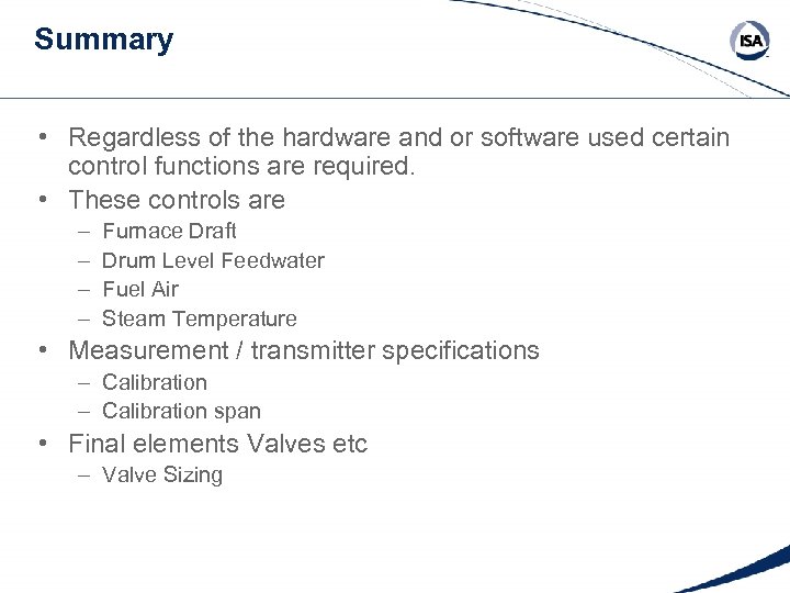 Summary • Regardless of the hardware and or software used certain control functions are required. • These controls are – – Furnace Draft Drum Level Feedwater Fuel Air Steam Temperature • Measurement / transmitter specifications – Calibration span • Final elements Valves etc – Valve Sizing