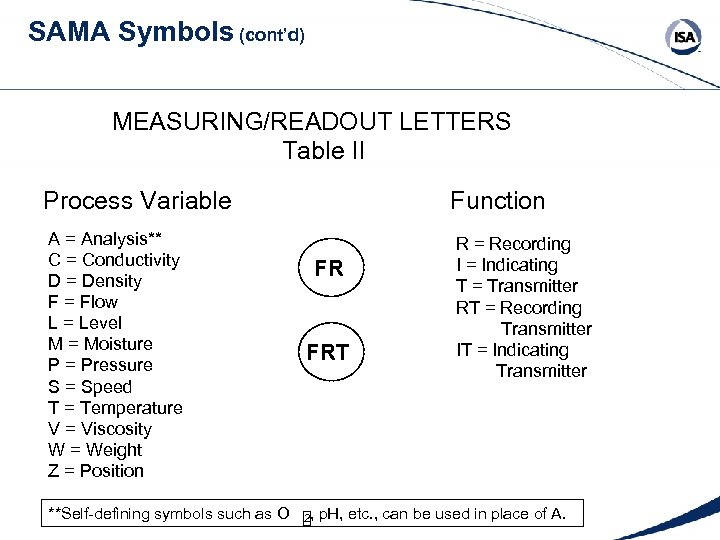 SAMA Symbols (cont’d) MEASURING/READOUT LETTERS Table II Process Variable Function A = Analysis** C = Conductivity D = Density F = Flow L = Level M = Moisture P = Pressure S = Speed T = Temperature V = Viscosity W = Weight Z = Position FRT **Self-defining symbols such as O 2, FR R = Recording I = Indicating T = Transmitter RT = Recording Transmitter IT = Indicating Transmitter p. H, etc. , can be used in place of A.