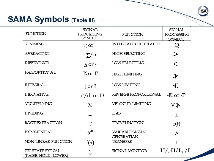 SAMA Symbols (Table III) FUNCTION SUMMING SIGNAL PROCESSING SYMBOL or + FUNCTION INTEGRATE OR TOTALIZE AVERAGING /n or - LOW SELECTING PROPORTIONAL K or P HIGH LIMITING or I Q HIGH SELECTING DIFFERENCE SIGNAL PROCESSING SYMBOL LOW LIMITING INTEGRAL DERIVATIVE d/dt or D REVERSE PROPORTIONAL MULTIPLYING X VELOCITY LIMITING DIVIDING BIAS ROOT EXTRACTION TIME FUNCTION n EXPONENTIAL X NON-LINEAR FUNCTION f(x) TRI-STATE SIGNAL (RAISE, HOLD, LOWER) VARIABLE SIGNAL GENERATION TRANSFER SIGNAL MONITOR -K or -P V f(t) A T H/, H/L, /L