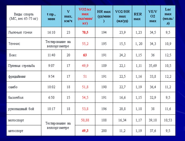 Максимальное потребление кислорода (МПК) у спортсменов различных специализаций