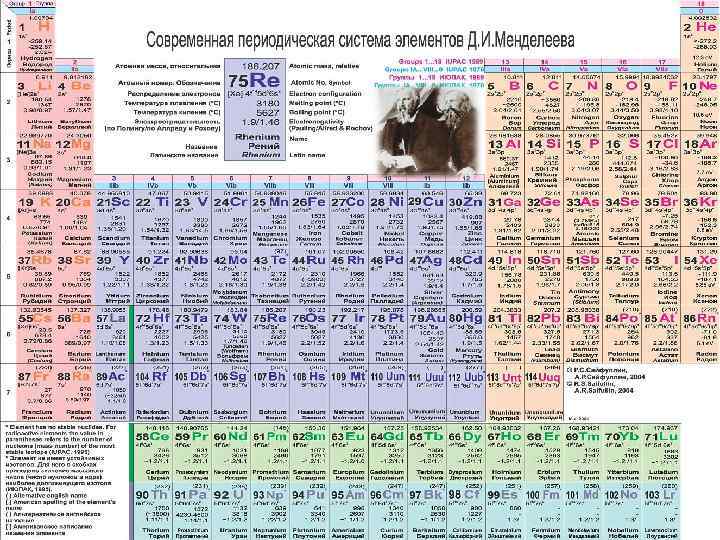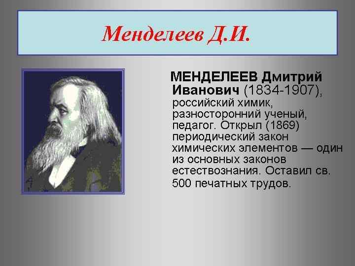 Периодическая система химических элементов (таблица Менделеева) — классификация химических элементов, устанавливающая зависимость различных свойств элементов от заряда атомного ядра. Система является графическим выражением периодического закона, установленного русским химиком Д. И. Менделеевым в 1869 году. Её первоначальный вариант был разработан Д. И. Менделеевым в 1869— 1871 годах и устанавливал зависимость свойств элементов от их атомного веса (по-современному от атомной массы). Всего предложено несколько сотен[1] вариантов изображения периодической системы (аналитических кривых, таблиц, геометрических фигур и т. п. ). В современном варианте системы предполагается сведение элементов в двумерную таблицу, в которой каждый столбец (группа) определяет основные физико-химические свойства, а строки представляют собой периоды, в определённой мере подобные другу.