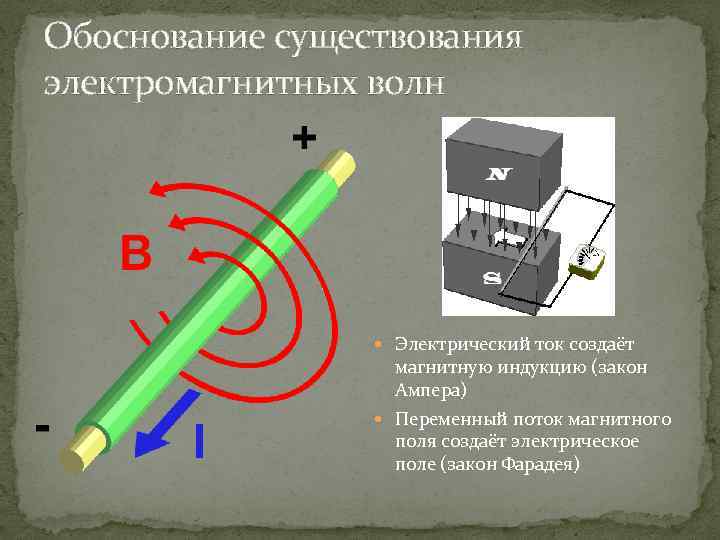 Обоснование существования электромагнитных волн Электрический ток создаёт магнитную индукцию (закон Ампера) Переменный поток магнитного поля создаёт электрическое поле (закон Фарадея)