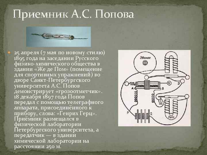 Приемник А. С. Попова 25 апреля (7 мая по новому стилю) 1895 года на заседании Русского физико-химического общества в здании «Же де Пом» (помещение для спортивных упражнений) во дворе Санкт-Петербургского университета А. С. Попов демонстрирует «грозоотметчик» . 18 декабря 1897 года Попов передал с помощью телеграфного аппарата, присоединённого к прибору, слова: «Генрих Герц» . Приёмник размещался в физической лаборатории Петербургского университета, а передатчик — в здании химической лаборатории на расстоянии 250 м.