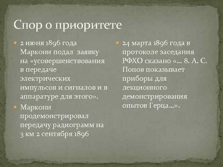 Спор о приоритете 2 июня 1896 года Маркони подал заявку на «усовершенствования в передаче электрических импульсов и сигналов и в аппаратуре для этого» . Маркони продемонстрировал передачу радиограмм на 3 км 2 сентября 1896 24 марта 1896 года в протоколе заседания РФХО сказано «… 8. А. С. Попов показывает приборы для лекционного демонстрирования опытов Герца…» .