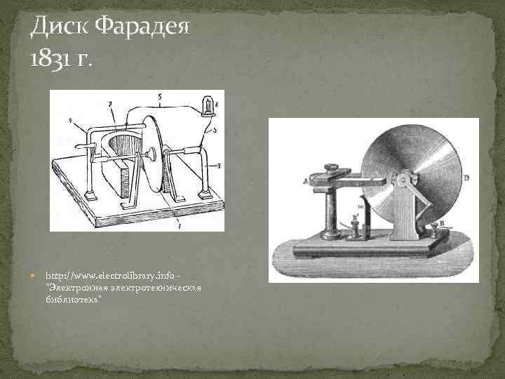 Диск Фарадея 1831 г. http: //www. electrolibrary. info "Электронная электротехническая библиотека"