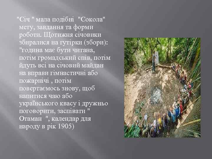 "Січ " мала подібні "Сокола" мету, завдання та форми роботи. Щотижня січовики збиралися на гутірки (збори): "година має бути читана, потім громадський спів, потім йдуть всі на січовий майдан на вправи гімнастичні або пожарнічі , потім повертаємось знову, щоб напитися чаю або українського квасу і дружньо поговорити, заспівати " Отаман ", календар для народу в рік 1905)