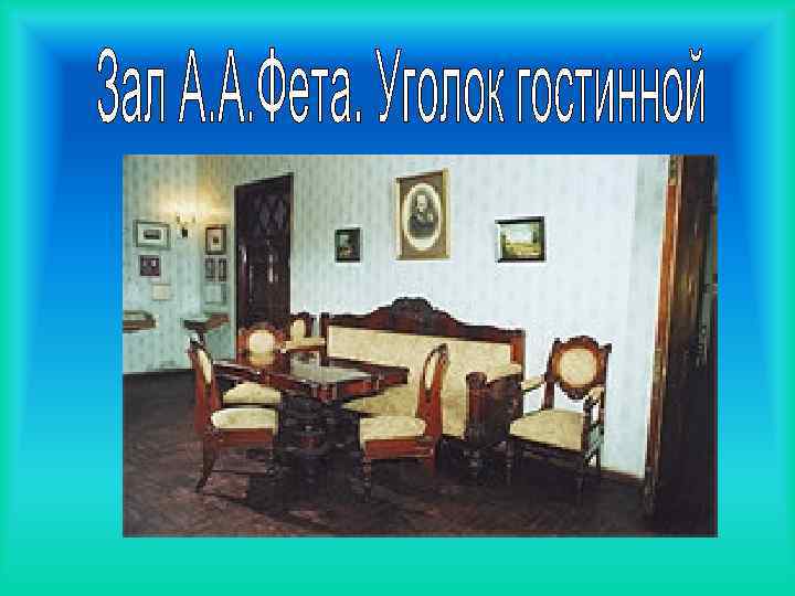 • В залах А. А. Фета воссоздана обстановка усадебного дома Фета, в которой создавались огромной лирической силы произведения поэта, многие из которых стали популярными романсами. • В творческую лабораторию поэта вводит также реконструированный уголок Московского кабинета: письменный стол с рукописями, кресло, книжный шкаф с прижизненными изданиями произведений Фета, многие из которых с автографами