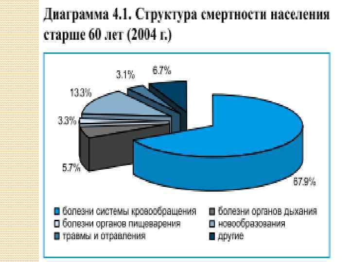 В республике, как и в большинстве других стран, мужская смертность превышает женскую, и это преобладание начинается в молодых возрастах: например, в возрастной группе 15– 19 лет – в 2 раза, а в 25– 29 лет – в 3 раза из-за повышенной смертности от несчастных случаев, а в старших возрастах – за счет большой смертности мужчин от сердечно-сосудистых заболеваний. Анализ структуры смертности по причинам является чрезвычайно важной задачей, так как причины, от которых умирают люди, тесно связаны с условиями труда, образом жизни, уровнем развития здравоохранения, общим уровнем социальноэкономического развития. В структуре смертности населения старше 60 лет 67, 9% занимают болезни системы кровообращения, 13, 3% – новообразования, 5, 7% – болезни органов дыхания, 3, 3% – болезни органов пищеварения