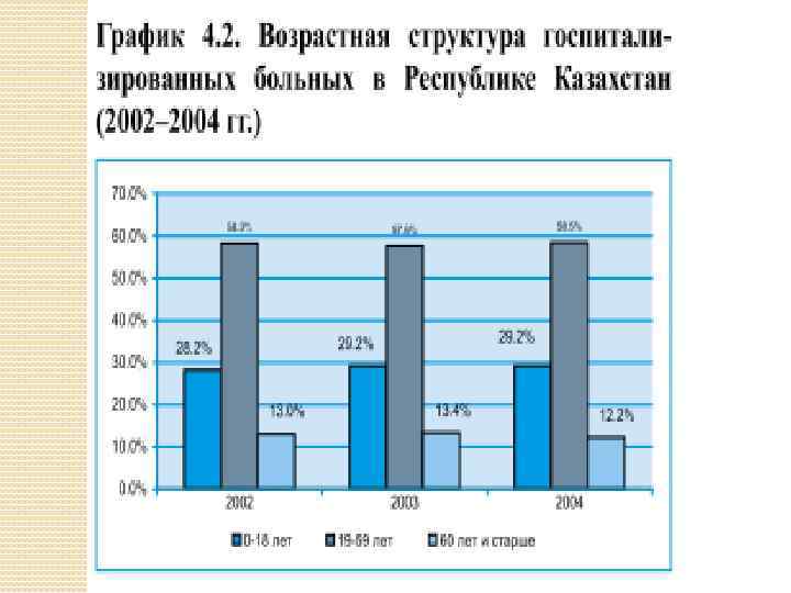 СТАЦИОНАРНАЯ ПОМОЩЬ ЛИЦАМ ПОЖИЛОГО ВОЗРАСТА По данным Комитета по контролю за качеством медицинских услуг Министерства здравоохранения Республики Казахстан, в стране в 2002 г. было пролечено в стационарных условиях 1 552 886 человек, в том числе 203 282 лица 60 лет и старше (13%); в 2003 г. – 1 906 470 больных, в том числе 256 124 лица 60 лет и старше (13, 4%); в 2004 г. – соответственно 1 558 481 и 190 615 человек, или 12, 2%