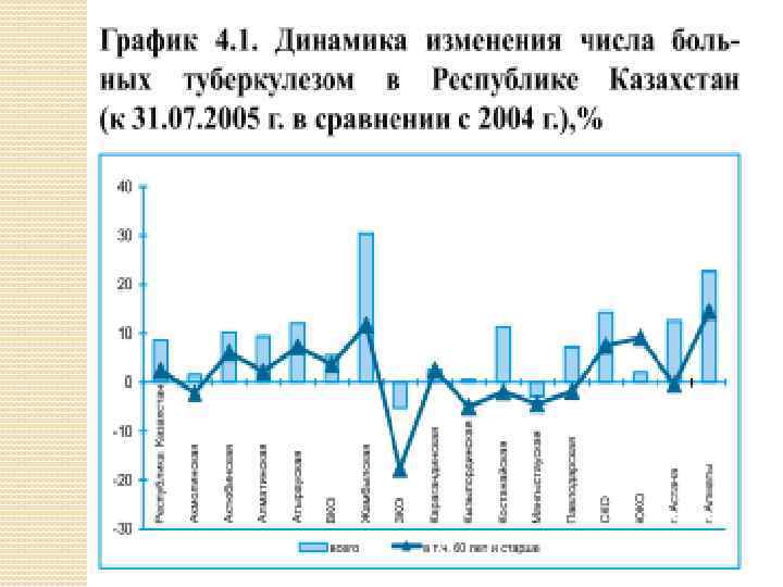 К сожалению, в Казахстане официальной статистики по учету заболеваемости лиц пожилого возраста нет. В последние годы создаются базы данных о количестве больных лишь по социально значимым заболеваниям: онкология, туберкулез, сахарный диабет, на основании которых можно анализировать показатели здоровья пожилого населения. По данным Национального регистра больных туберкулезом, в городах уровень заболеваемости в 1, 2 раза выше, чем в селах. В 2004– 2005 гг. наблюдается рост туберкулеза от 284610 до 311650 случаев, или на 8, 7%, из них среди лиц старше 60 лет этот показатель составил соответственно 14932 и 15295 случаев (рост 2, 4%). Наибольший рост заболевания тубекрулезом за истекший период выявлен в Жамбылской области (30, 4% в целом и 11, 7% среди лиц старше 60 лет) и г. Алматы (22, 7% в целом и 14, 5% среди лиц старше 60 лет).