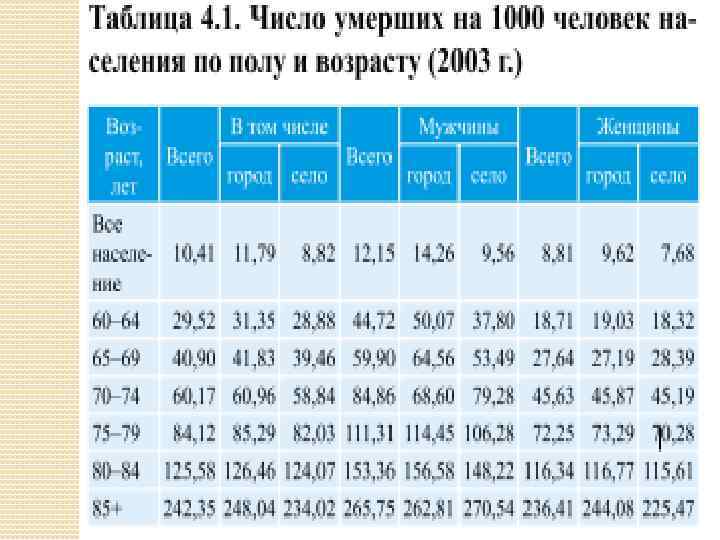 Таким образом, в настоящее время общий коэффициент смертности остается на высоком уровне, и прочих других обстоятельствах, обусловливающих такой уровень смертности, доминирующую роль сыграло старение населения, то есть увеличение в составе населения лиц старшего возраста, смертность среди которых выше.