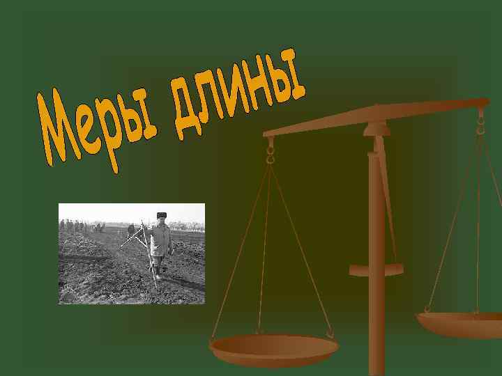 Меры длины Перст 2 см Вершок 4, 5 см Малая пядь Пядь великая 18 см 22 см Локоть 40 см Аршин 71, 1 см Простая сажень Маховая сажень Косая сажень 152 см 176 см 216 см Шаг 71 см Миля 7, 468 км Верста первоначальная Межевая верста 1, 067 км 2, 13 км Дюйм 2, 54 см Ярд 91, 44 см Фут 30, 48 см Меры веса Золотник 4, 3 г Фунт 409, 51 г Пуд 16 кг Меры площади Десятина казенная 1, 09 га