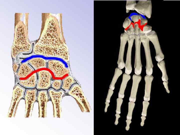 Сустав кисти, articulatio manus это комплексный сустав (art. complexa), который составлен из: 1 - art. radiocarpalis, 2 - art. mediocarpalis. Проксимальный ряд костей запястья (ossa scaphoideum, lunatum, triquetrum) является костным мениском в этом суставе