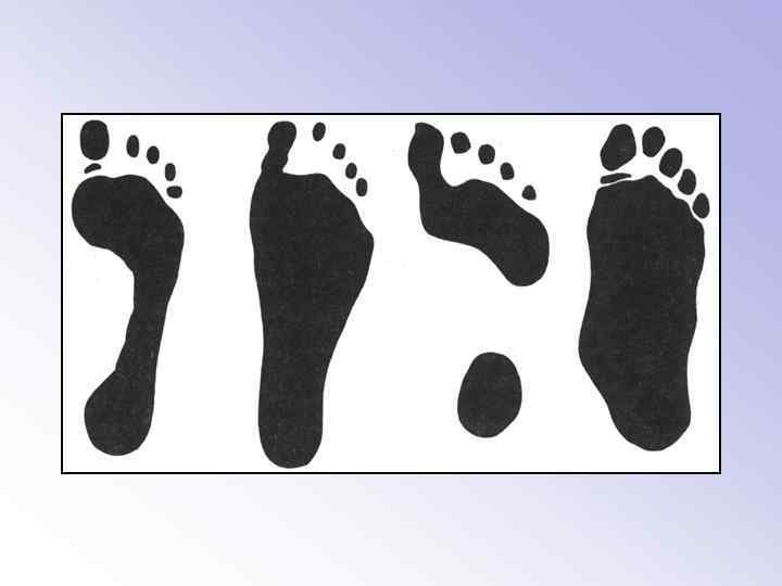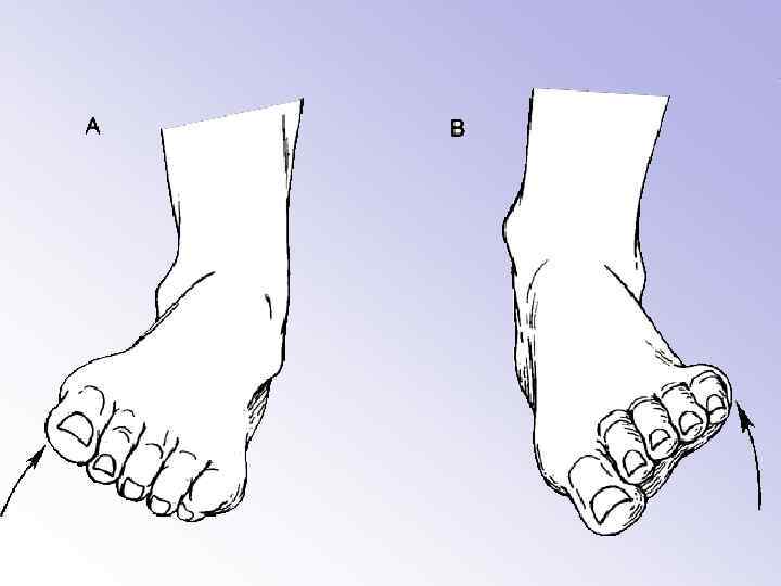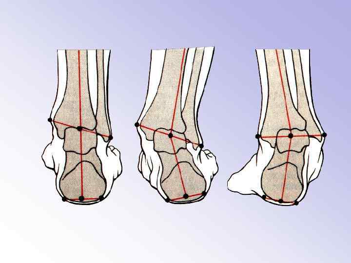 – стопа прямая (pes rectus) (нормальный отпечаток), – стопа плоская (pes planus) (плоскостопие), – сводчатая стопа (pes fornicatus) (высокий продольный свод), – стопа, повернутая наружу (внутренняя косолапость) (pes valgus) – стопа, повернутая внутрь (наружная косолапость) (pes varus)