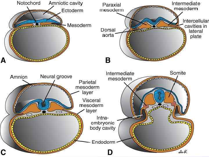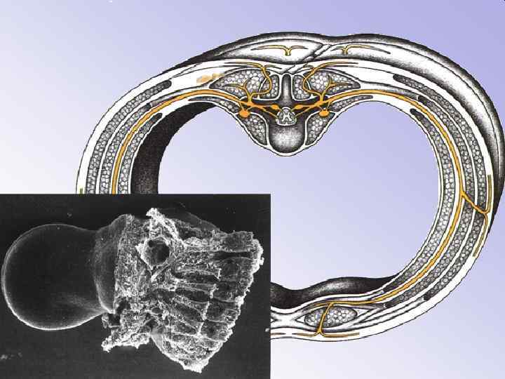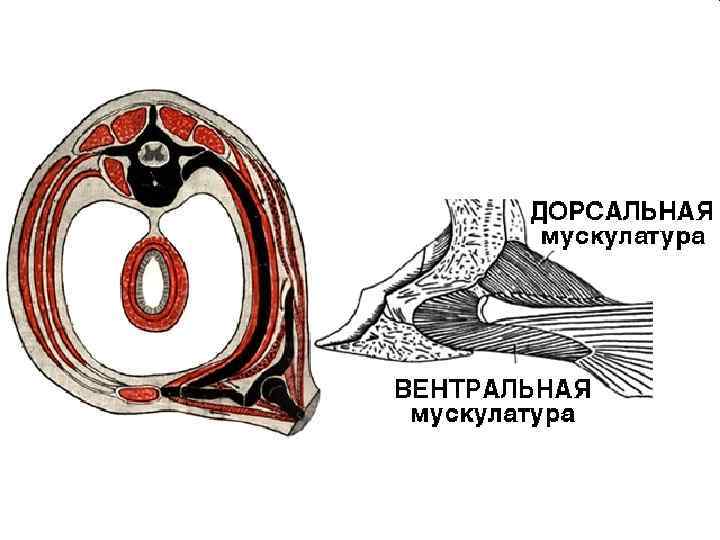В вентральном направлении из них между эктодермой и висцеральным мезобластом вырастают вентральные отростки, являющиеся закладкой (источником) для вентральной группы мышц. Из исходных миотомов возникает дорзальная группа мышц