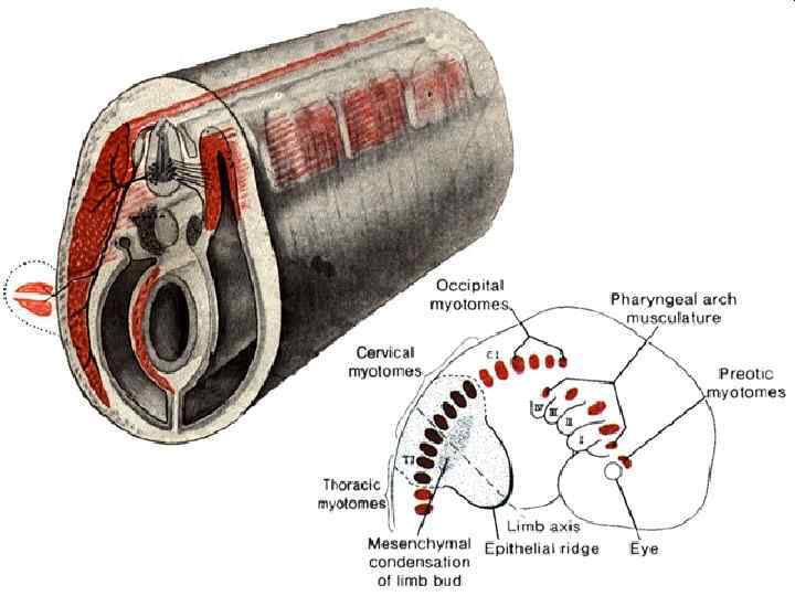 Поперечно-полосатые (скелетные) мышцы возникают из миотомов, которые затем разделяются на дорсальную и вентральную части