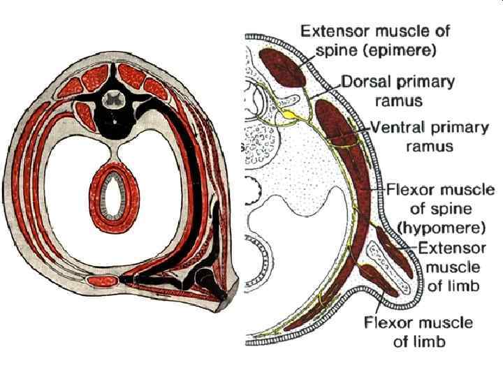 Дорзальная часть миотомов иннервируется дорзальными ветвями спинномозгового нерва (r. dorsalis n. spinalis), а вентральные части миотомов иннервируются вентральными ветвями (r. ventralis n. spinalis)