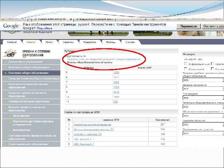 Интерфейс портала ФЦИОР Верхняя панель закладок . Служебная панель закладок активируется нажатием кнопки, расположенной в правой части верхней панели закладок