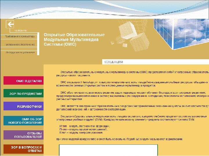 ОМС(открытые модульные системы) открывают Internet-доступ к высокоинтерактивным, мультимедийно-насыщенным учебным ресурсам, объединяя возможности сетевых открытых систем и полноценных мультимедиа продуктов. обеспечивают практическое решение задач индивидуализации обучения благодаря архитектурным решениям, предусматривающим включение в систему вариативных (по содержанию, методикам, технологиям исполнения) электронных учебных материалов. является электронным образовательным ресурсом с неограниченным жизненным циклом за счет открытости для дополнений /изменений и автономности составляющих.
