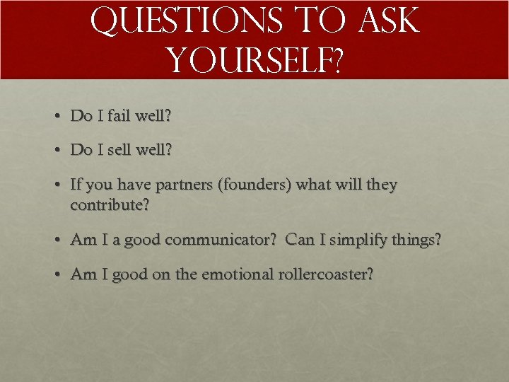 Questions to ask yourself? • Do I fail well? • Do I sell well? • If you have partners (founders) what will they contribute? • Am I a good communicator? Can I simplify things? • Am I good on the emotional rollercoaster?
