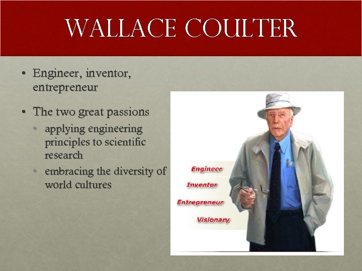 Wallace Coulter • Engineer, inventor, entrepreneur • The two great passions • applying engineering principles to scientific research • embracing the diversity of world cultures