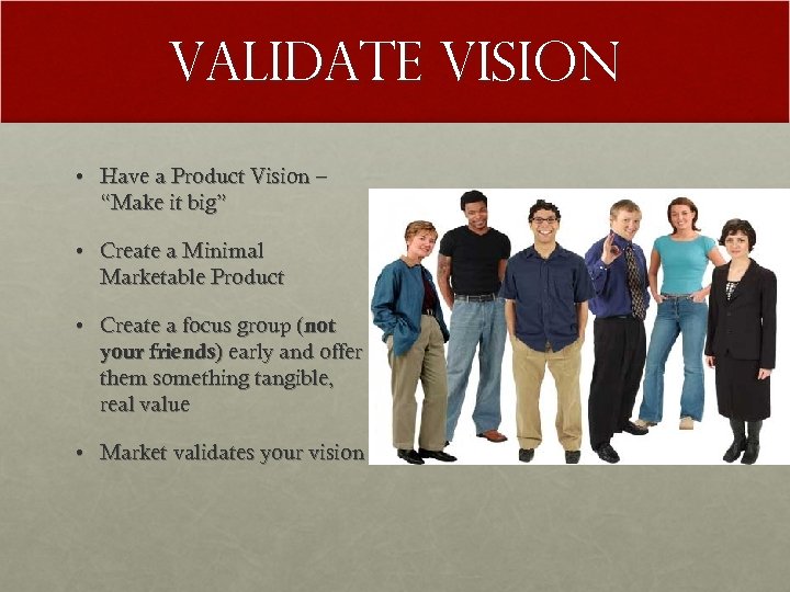 Validate Vision • Have a Product Vision – “Make it big” • Create a Minimal Marketable Product • Create a focus group (not your friends) early and offer them something tangible, real value • Market validates your vision