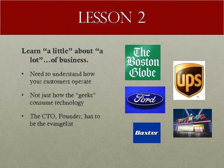 Lesson 2 Learn “a little” about “a lot”…of business. • Need to understand how your customers operate • Not just how the “geeks” consume technology • The CTO, Founder, has to be the evangelist