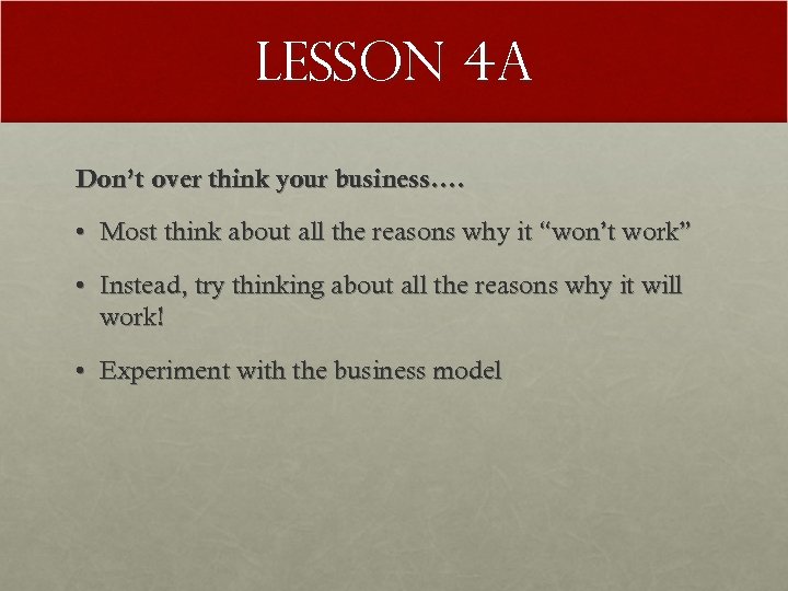Lesson 4 A Don’t over think your business…. • Most think about all the reasons why it “won’t work” • Instead, try thinking about all the reasons why it will work! • Experiment with the business model