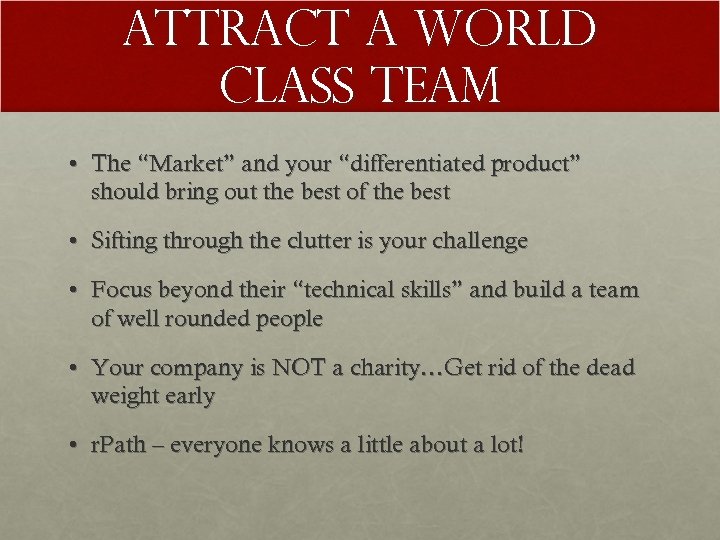 Attract a world Class Team • The “Market” and your “differentiated product” should bring out the best of the best • Sifting through the clutter is your challenge • Focus beyond their “technical skills” and build a team of well rounded people • Your company is NOT a charity…Get rid of the dead weight early • r. Path – everyone knows a little about a lot!