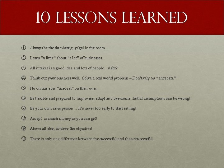 10 Lessons Learned ① Always be the dumbest guy/gal in the room. ② Learn “a little” about “a lot” of businesses. ③ All it takes is a good idea and lots of people…right? ④ Think out your business well. Solve a real world problem – Don’t rely on “ ancedata” ⑤ No on has ever “made it” on their own. ⑥ Be flexible and prepared to improvise, adapt and overcome. Initial assumptions can be wrong! ⑦ Be your own sales person… It’s never too early to start selling! ⑧ Accept as much money as you can get! ⑨ Above all else, achieve the objective! ⑩ There is only one difference between the successful and the unsuccessful…