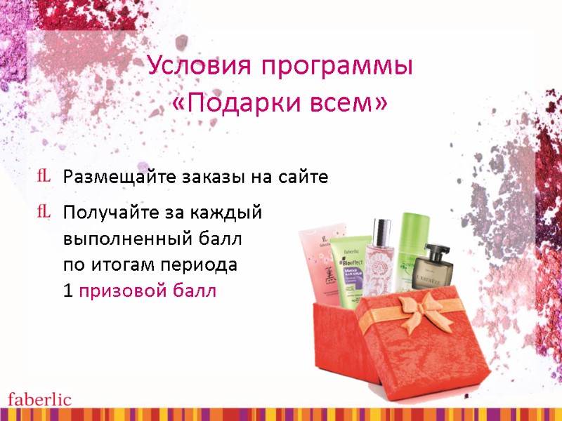 Условия программы «Подарки всем» Размещайте заказы на сайте Получайте за каждый выполненный балл по итогам периода 1 призовой балл