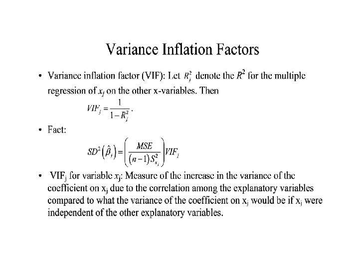 Problems caused by multicollinearity • If interest is in predicting y, as long as pattern of multicollinearity continues for those observations where forecasts are desired (e. g. , house size and lot size are either both high, both medium or both small), multicollinearity is not particularly problematic. • If interest is in obtaining individual regression coefficients, there is no good solution in face of multicollinearity. • If interest is in predicting y for observations where pattern of multicollinearity is different than that in sample (e. g. , large house size, small lot size), no good solution (this would be extrapolation).