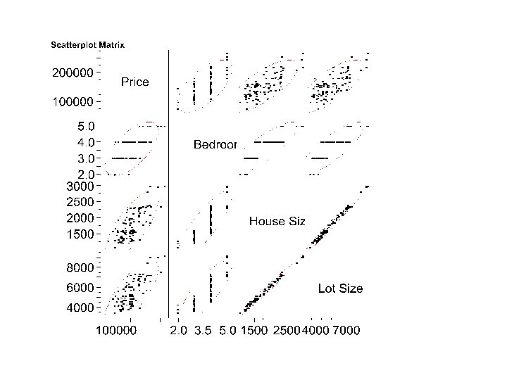 Multicollinearity • Multicollinearity: Explanatory variables are highly correlated with each other. It is often hard to determine their individual regression coefficients. • There is very little information in the data set to find out what would happen if we fix house size and change lot size.