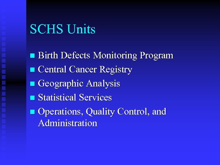 SCHS Units Birth Defects Monitoring Program n Central Cancer Registry n Geographic Analysis n Statistical Services n Operations, Quality Control, and Administration n