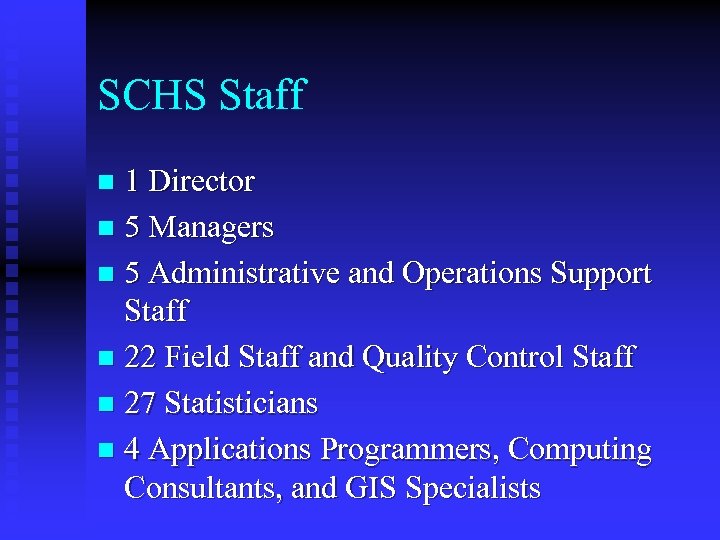 SCHS Staff 1 Director n 5 Managers n 5 Administrative and Operations Support Staff n 22 Field Staff and Quality Control Staff n 27 Statisticians n 4 Applications Programmers, Computing Consultants, and GIS Specialists n