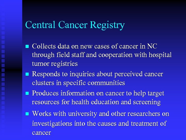 Central Cancer Registry n n Collects data on new cases of cancer in NC through field staff and cooperation with hospital tumor registries Responds to inquiries about perceived cancer clusters in specific communities Produces information on cancer to help target resources for health education and screening Works with university and other researchers on investigations into the causes and treatment of cancer
