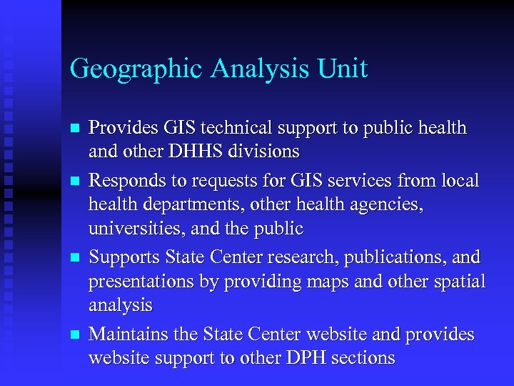 Geographic Analysis Unit n n Provides GIS technical support to public health and other DHHS divisions Responds to requests for GIS services from local health departments, other health agencies, universities, and the public Supports State Center research, publications, and presentations by providing maps and other spatial analysis Maintains the State Center website and provides website support to other DPH sections