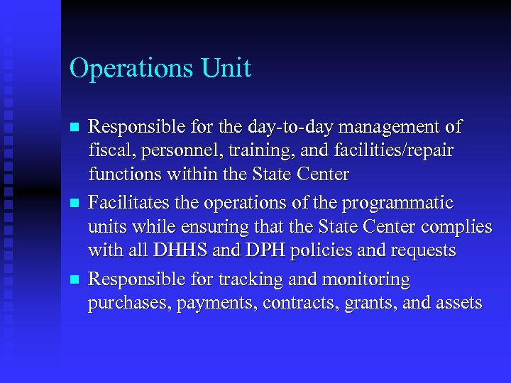 Operations Unit n n n Responsible for the day-to-day management of fiscal, personnel, training, and facilities/repair functions within the State Center Facilitates the operations of the programmatic units while ensuring that the State Center complies with all DHHS and DPH policies and requests Responsible for tracking and monitoring purchases, payments, contracts, grants, and assets