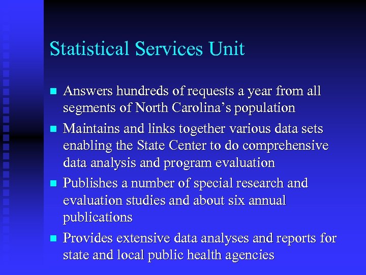 Statistical Services Unit n n Answers hundreds of requests a year from all segments of North Carolina’s population Maintains and links together various data sets enabling the State Center to do comprehensive data analysis and program evaluation Publishes a number of special research and evaluation studies and about six annual publications Provides extensive data analyses and reports for state and local public health agencies