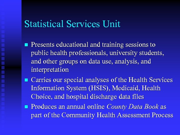 Statistical Services Unit n n n Presents educational and training sessions to public health professionals, university students, and other groups on data use, analysis, and interpretation Carries our special analyses of the Health Services Information System (HSIS), Medicaid, Health Choice, and hospital discharge data files Produces an annual online County Data Book as part of the Community Health Assessment Process